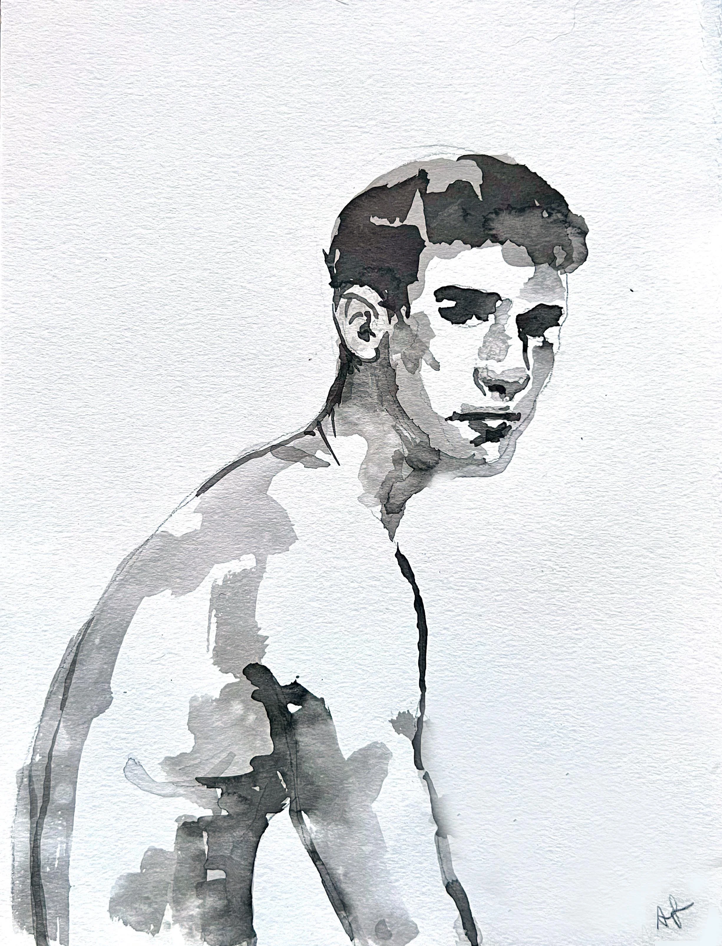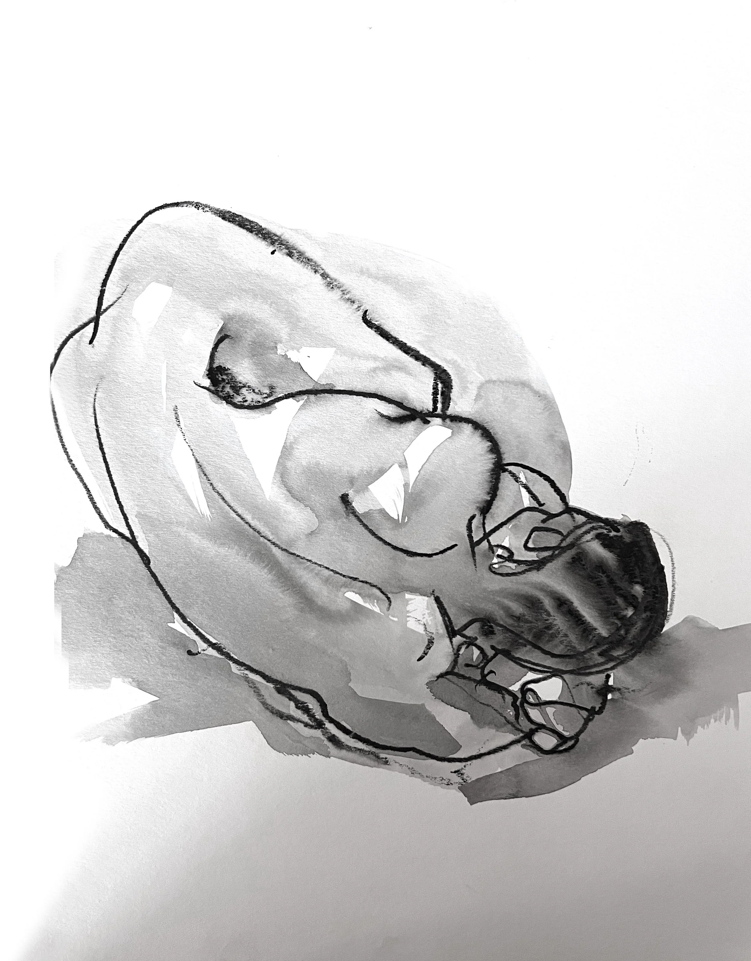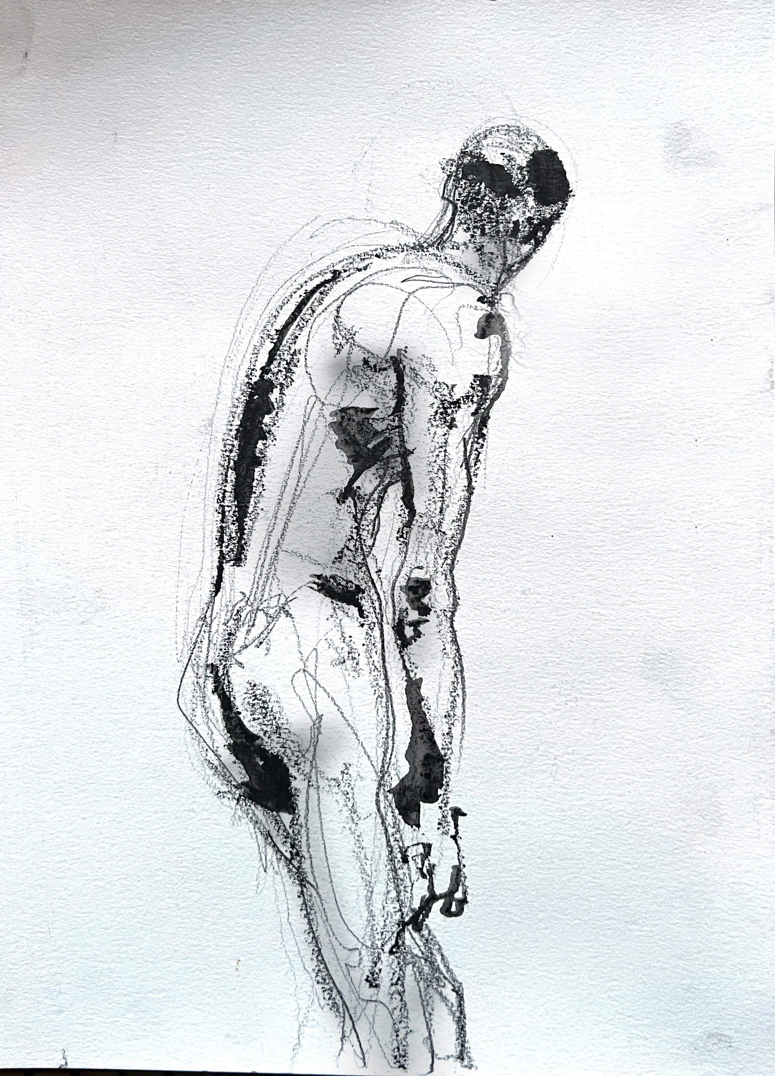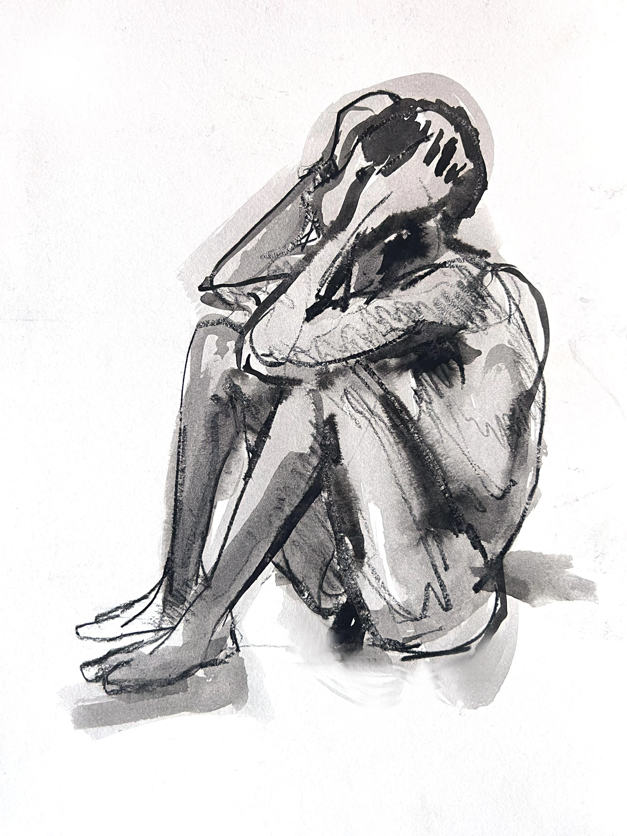 These figure drawings share the same ethos as Atif’s abstract sketches: created with full presence in the moment, letting the hand work swiftly across the page to create lines and forms that pulse with spontaneous energy. Media includes sumi ink, conté crayon, charcoal and watercolor.