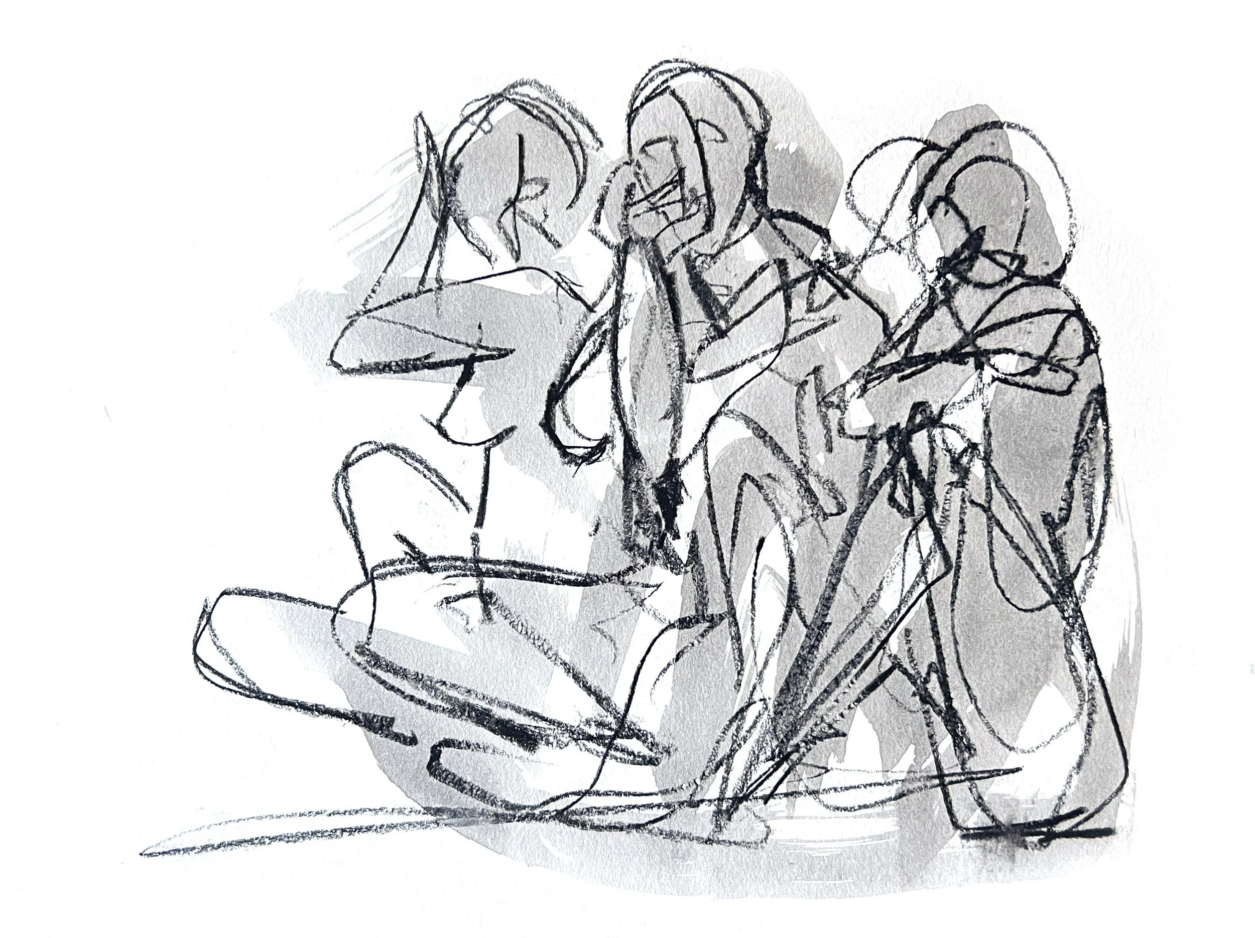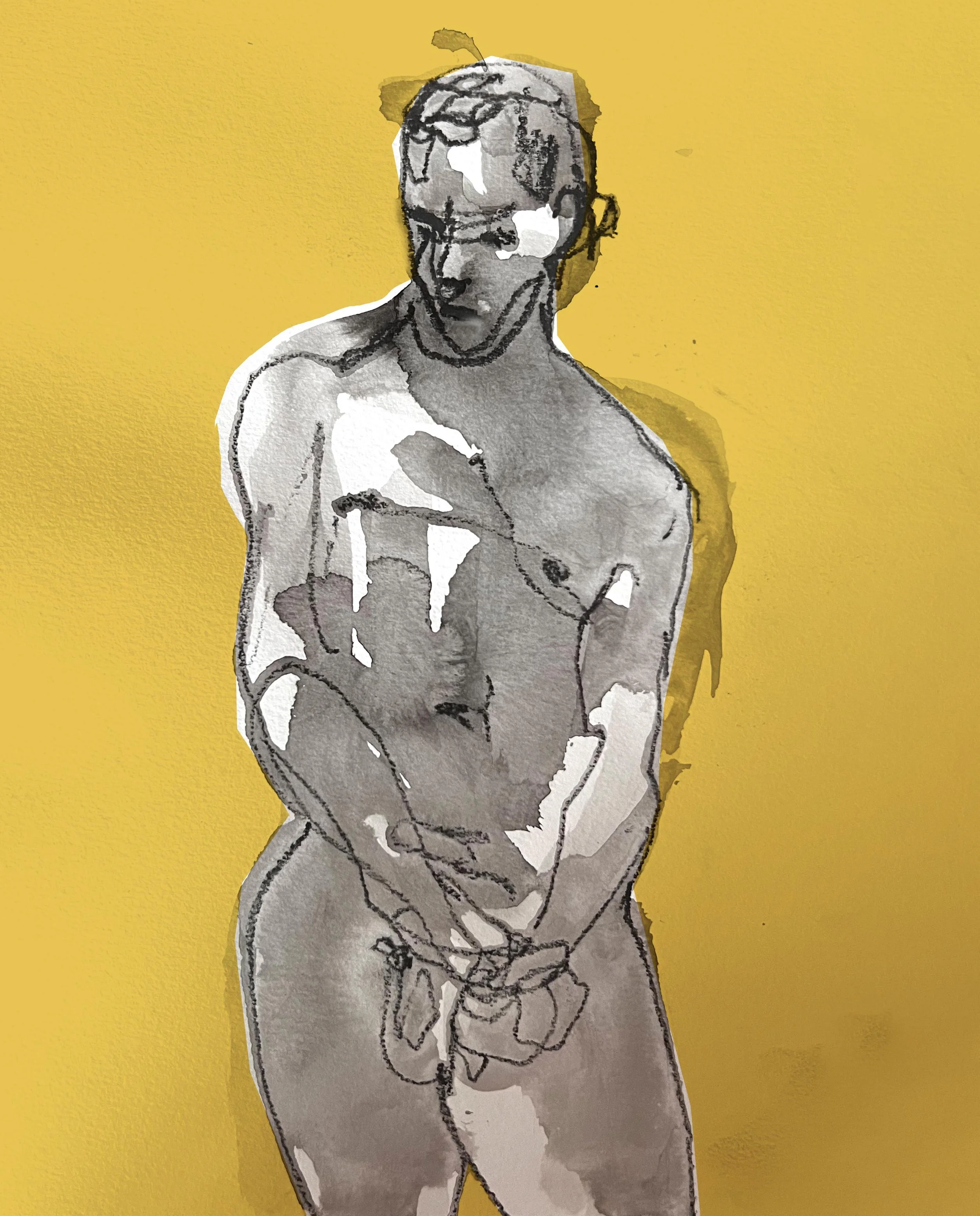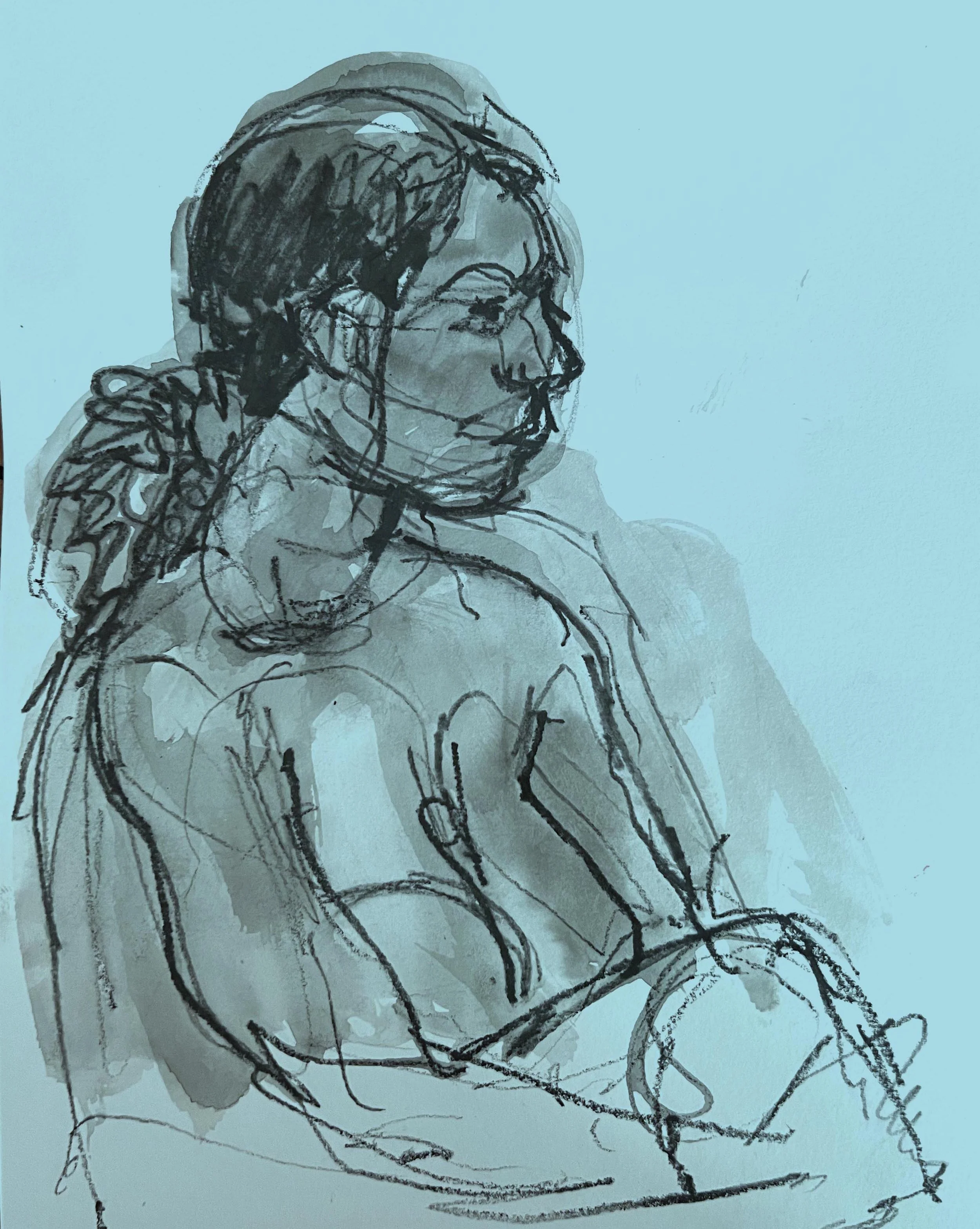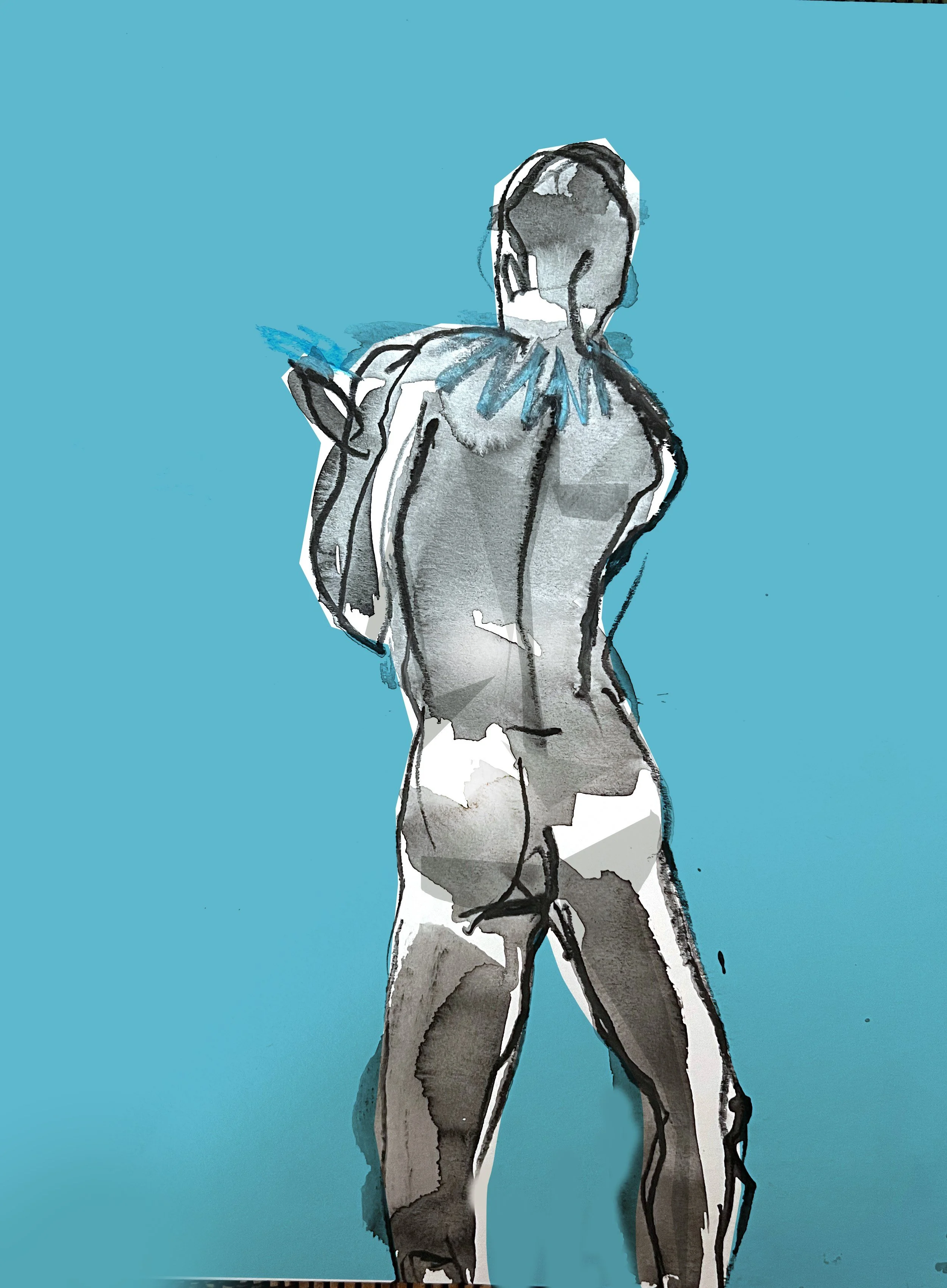 These figure drawings share the same ethos as Atif’s abstract sketches: created with full presence in the moment, letting the hand work swiftly across the page to create lines and forms that pulse with spontaneous energy. Media includes sumi ink, conté crayon, charcoal and watercolor.