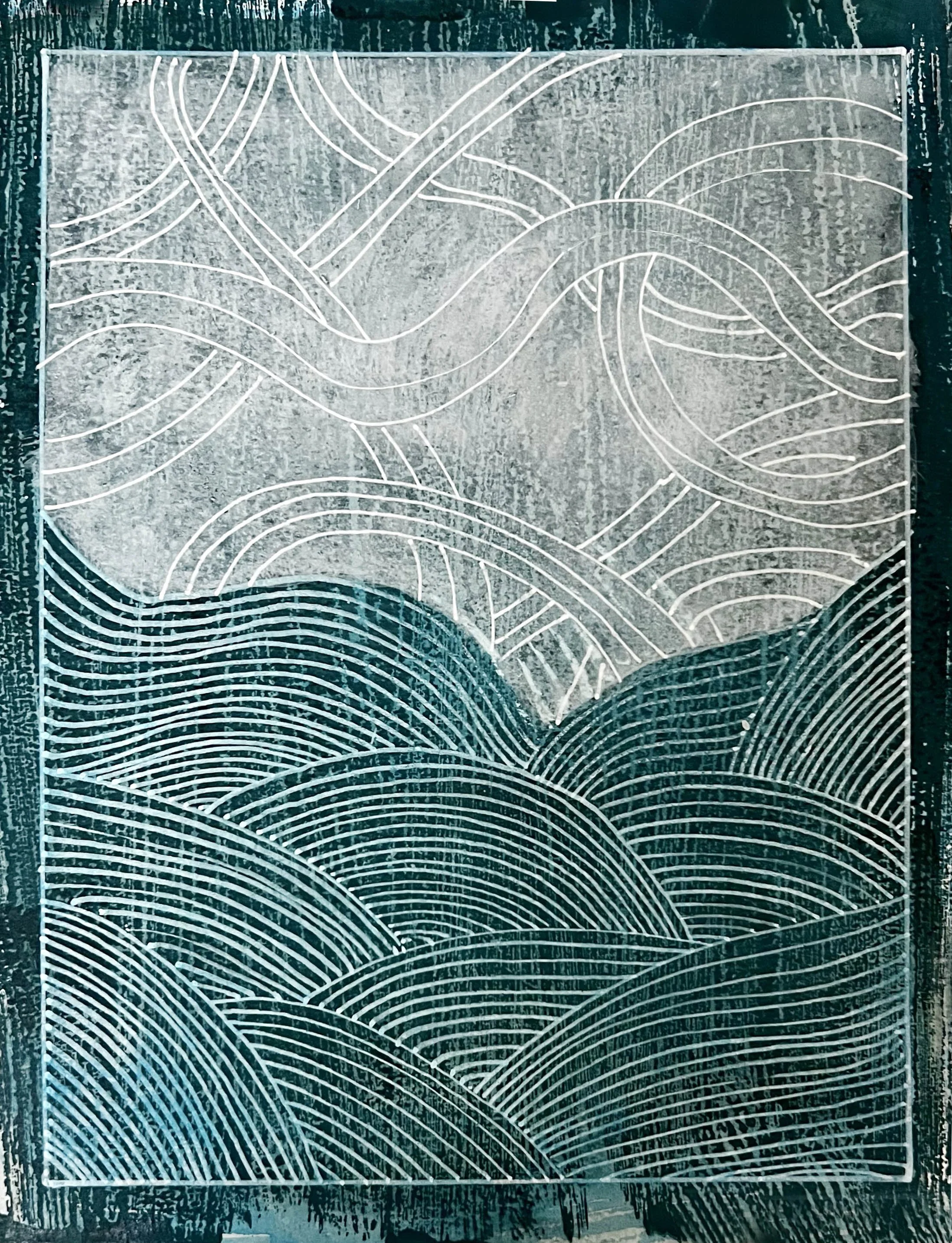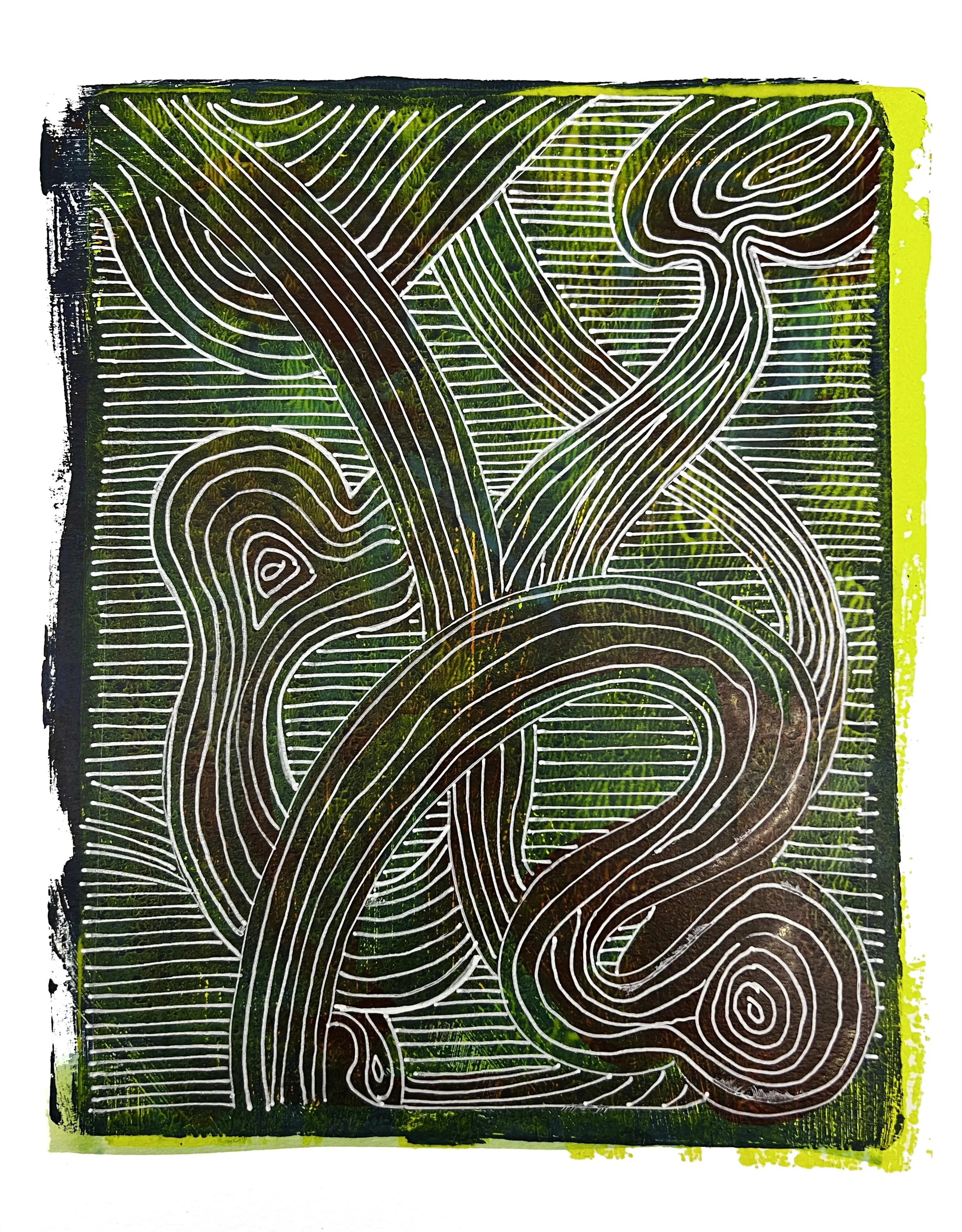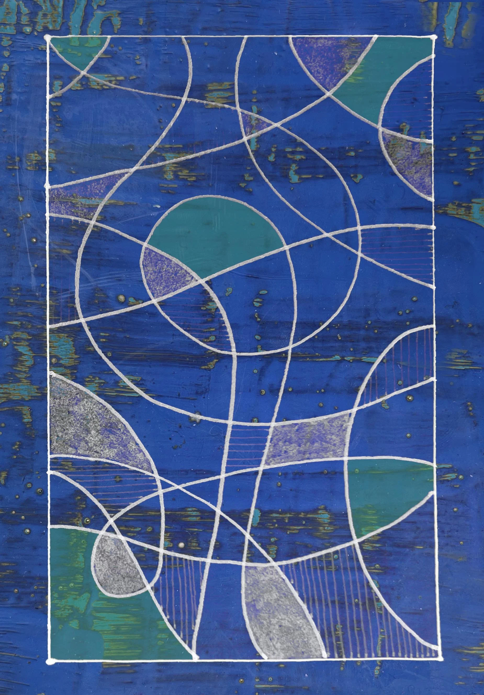 Mixed media works include monoprints, encaustic paintings, acrylic on wood panels and range in size from 11" x 15" to 3ft x 9ft. The compositions are an interplay of positive and negative forms, lines, and textures to engage viewers with the entire surface of each piece along the lines of musical compositions.